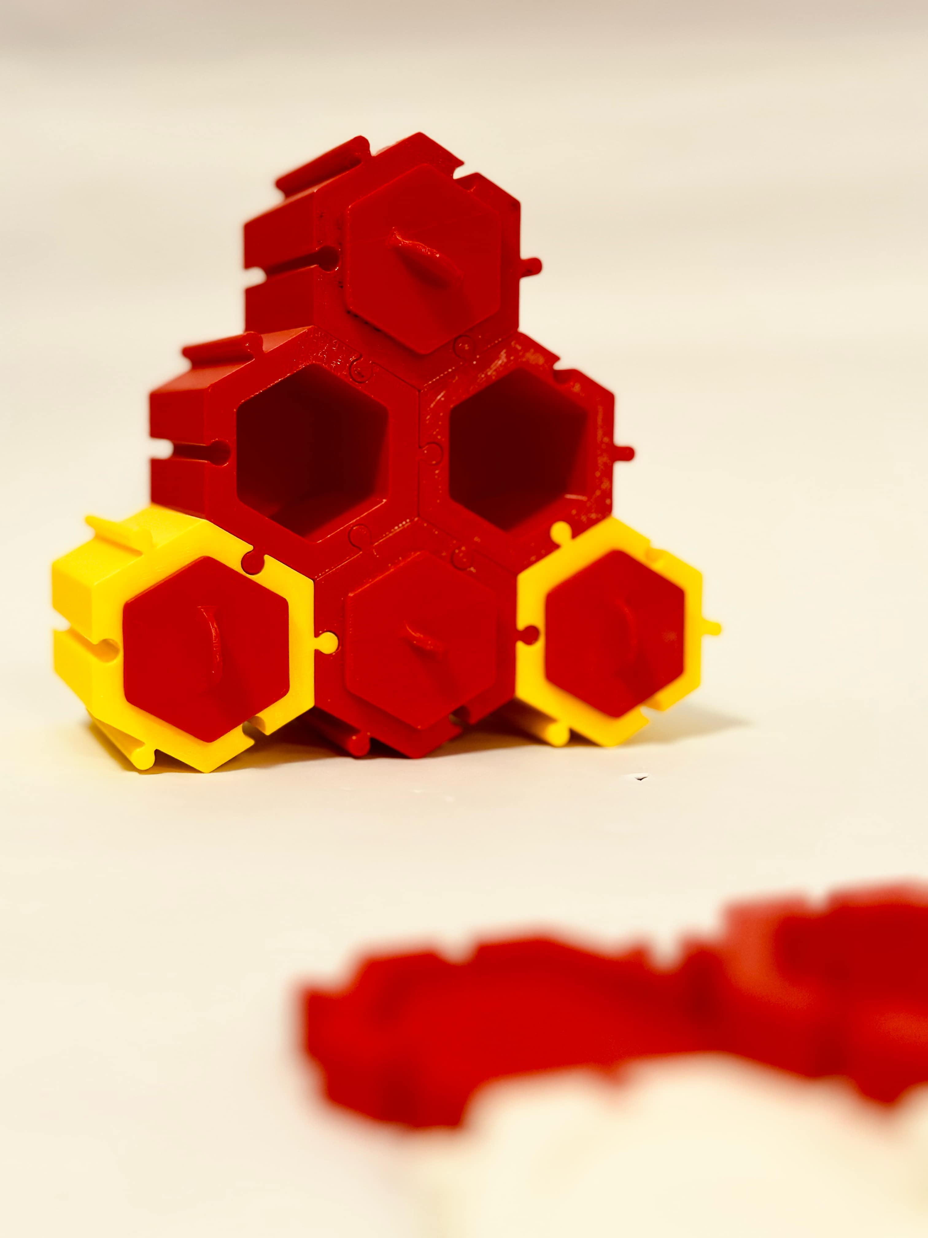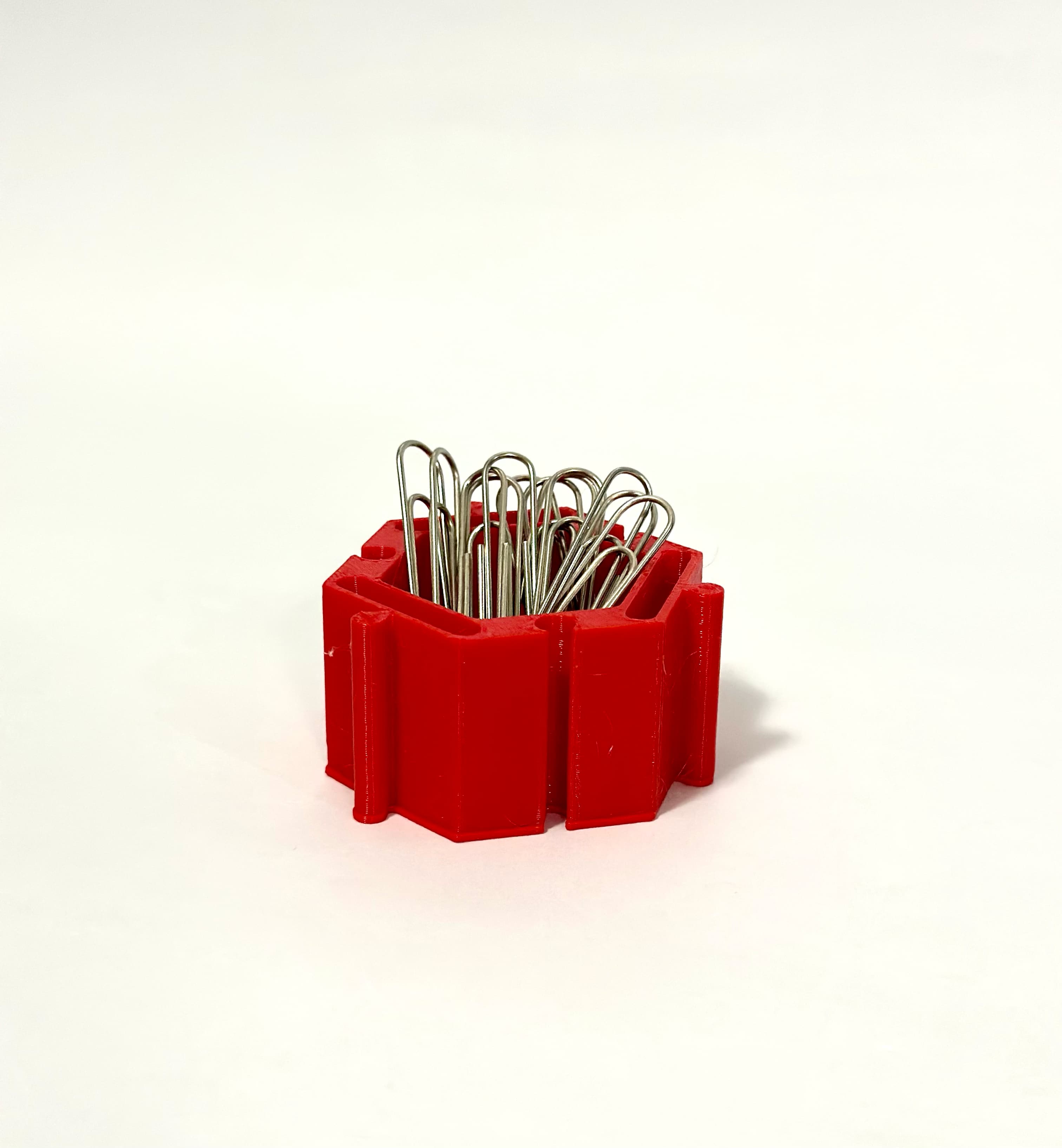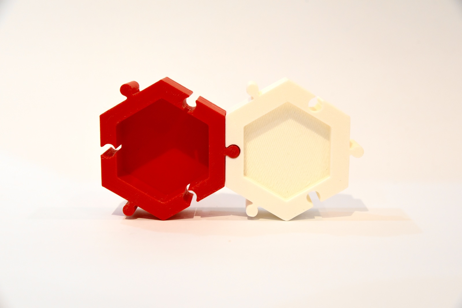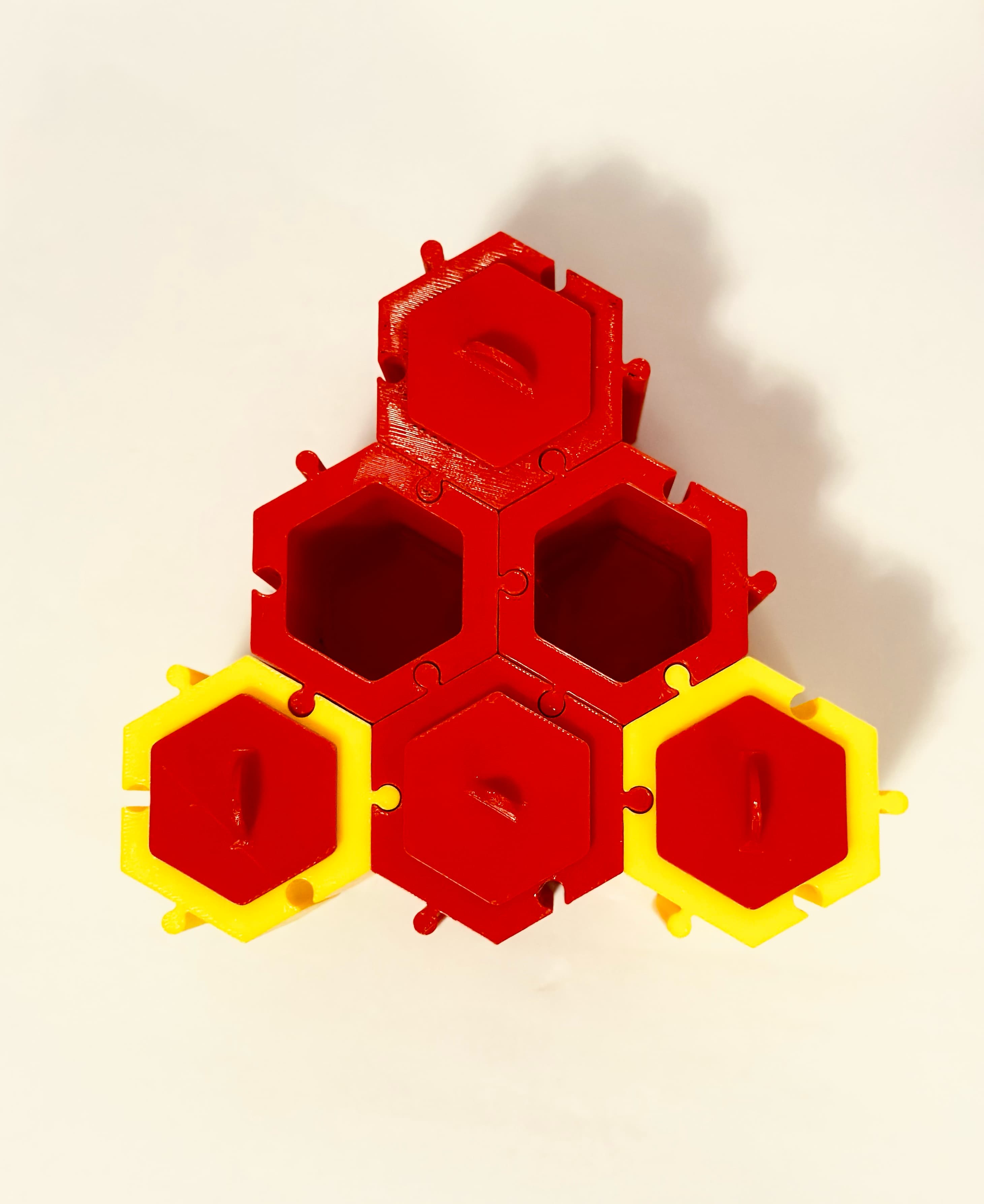 A modular hexagon organizer consists of hexagon-shaped compartments that can be arranged like honeycomb cells. Each unit is printed individually, and the modules connect through built-in clips, magnets, or interlocking grooves.