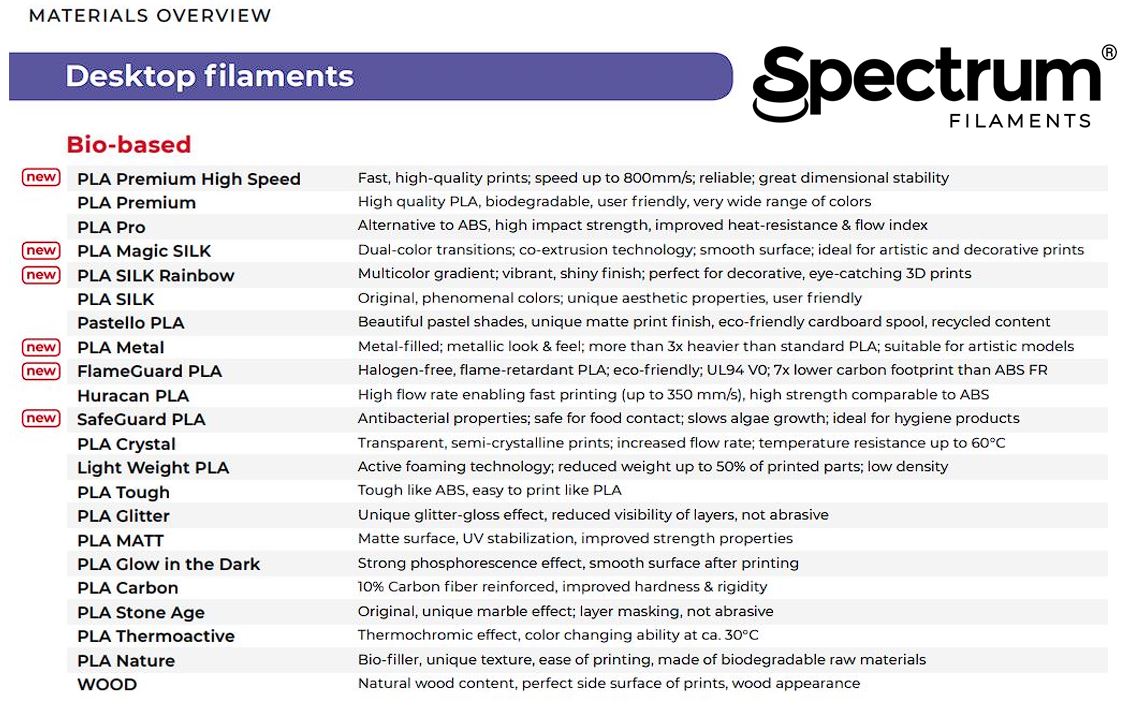Below is a sample of materials overview for PLA variety under Spectrum Filaments.